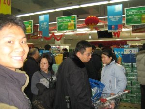 At 9:30am, we caught the apartment shuttle to a grocery chain called "Carrefour". I believe it’s the European equivalent to a Walmart that is expanding into China. There is also a Walmart in Beijing, but the apartment folks told us that Carrefour is closer. Tenille expected it to be full of expats from America and Europe… where we’d be able to talk and associate with the customers and employees.