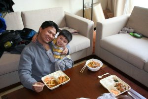 Big milestone for us. We decided we needed something quick for lunch. Our friend, Curt, recommended Hollywood (which is a fast food restaurant) about 1 block from our apartment. He said it was the Chinese version of a Korean version of western food. I didn’t fully understand what that meant, but I ran over for some takeout. There were pictures of food pasted all over the store – bibimbap (Korean mixed rice), Teriyaki Chicken, Chicken-katsu (breaded cutlet), hamburger steak, eel and rice, rice omelette, curry and rice, etc, etc. I was the only customer and two ladies stood behind a counter ready to take orders. I called Tenille and described to her what was available. She picked Chicken and Mushroom. I took a deep breath, and stepped up to the counter to order. I said, I didn’t speak very well (in my best Chinese)… The lady smiled and said something. I was hoping it was something like "It’s ok." What I really need to learn is, "I don’t speak very well, and I won’t be able to understand a word you say." She whipped out a laminated menu with pictures and English on it. I didn’t see the Chicken and Mushroom, so I walked over to the sign and started pointing at the chicken and mushroom. She came over and waved her hand in my face, then turned the sign around. I assumed that meant it was unavailable. So, I substituted Teriyaki Chicken (a safe choice, I thought.) I pointed to three different menu items saying the word "this", "this", and "this". She nodded her head. Then she pointed to the prices. There were two prices. My general rule of thumb is always pick the cheap one. So that’s what I did. I figured out, that she was saying, small or big. I had ordered the small. The entire order came to 70 RMB ($10). I waited about 5-10 minutes, and they had a bag ready for me to go. I brought it home, and it was probably the quickest we’ve made and eaten a meal hands down. And the food was delicious.