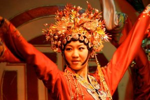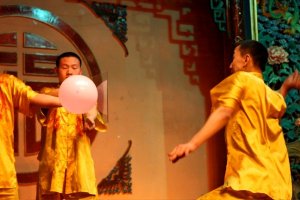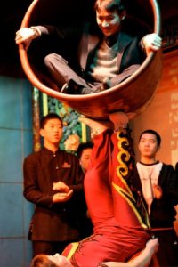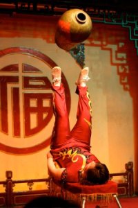 Then, a lady came out. She had enormous thighs. It didn’t take long to figure out why. She laid down on her back on what looked like a bench press bench. A man came and put a 10 gallon ceramic jug on her feet which was raised straight up over her body. She started twirling and rolling it with her feet. Sometimes she was spinning the jug so fast, it seemed like it would come crashing down into the audience. Then she carefully put the jug down with her feet. An MC came out and said a bunch of things, and four young men came out and lifted up an enormous jug. It looked like a planter that hold trees on city streets. It was about 4 feet high and about 3 feet in diameter. The young men strained to move it. It looked heavy. The hoisted this jug up on top of the lady’s feet. She then started rolling and twirling that jug, too. Then they asked for a volunteer from the audience. A man of light build in a suit came walking up to the stage. One of the men told him to go inside the jug and showed him how to sit inside. After the volunteer crawled in and sat Indian style in the jug, they hoisted up the jug again on to the lady’s feet. This looked like a lawsuit waiting to happen. But, my guess is that liability law is not too strong in China. You might get a sorry, but you’re probably not getting any big triple damage settlements… Anyway, the lady slowly rotated the jug around on her feet, and we could see the volunteer holding on for dear life inside the jug as he spun around atop this lady’s feet. After they put the jug away, I went over to try and lift the jug to see if they were just putting on an act to make it look heavy when it wasn’t… It was heavy. In fact, I think if it would have slipped and landed on you, it could cause severe injury if not death. Certainly any small animal would be killed.