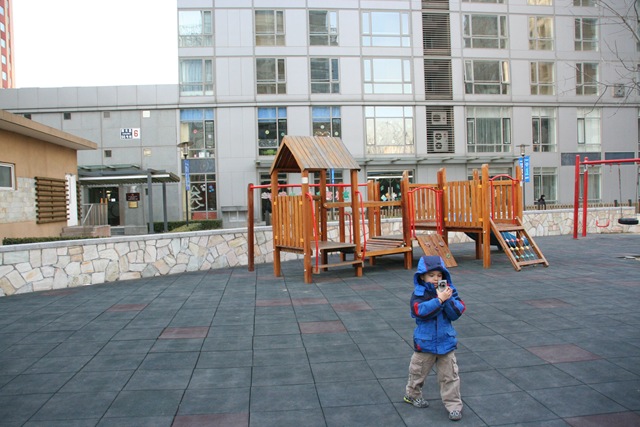 Caleb in front of the playground.  His preschool is in the background.  The bottom two floors of the building.