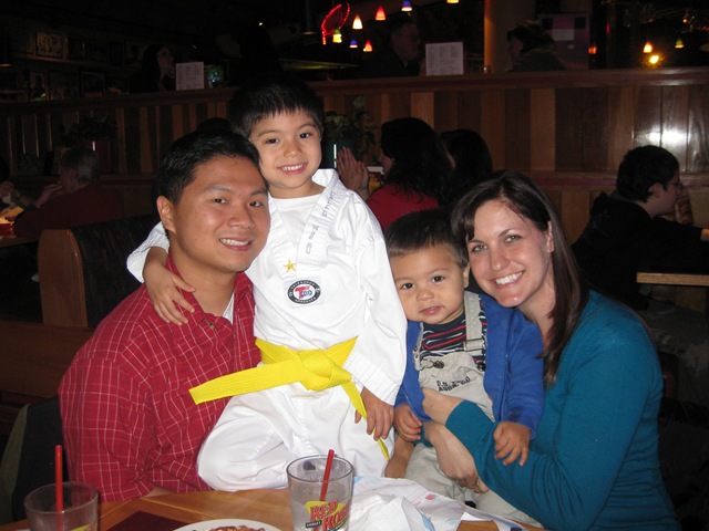He grabbed his now split pieces of wood and sat down at the edge of the mat anticipating his award – the yellow belt. After all of the belts were handed out, he came over to us, his family, and beamed as he held up his split piece of wood, his yellow belt certificate, and his old white belt which was now replaced by his new yellow belt which he wore.