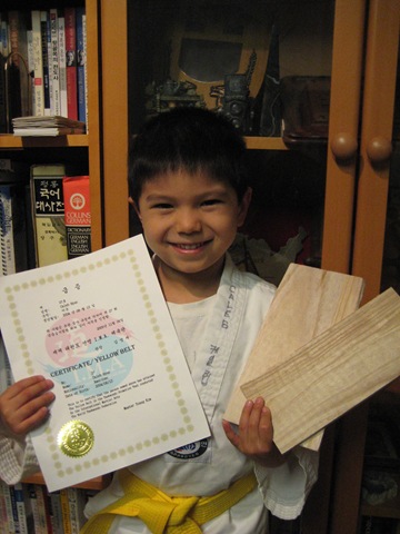 Caleb’s turn finally came up, and a cohort of all the white belts took to the mat. There were 3 of them. They were asked to do some basic punches and kicks, which all of them breezed through. They were each asked to say a few Korean words. One kid hesitated a bit, but for the most part they all passed easily. Finally, the board. From a distance it looked like a fairly thin board. Maybe about a 1/3 of an inch thick. Caleb was instructed to make a fist, and pound it down on the board like a hammer. He did. And he was the first to bust through his board in one thwack. Those few seconds seemed like it was the proudest single moment in this boy’s short life. I confirmed this by asking him a few days ago, to which he also added. “Do you know what the proudest day of my life will be? When I get my black belt!”