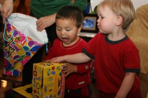 As with any two year old, he’s learning how to share (which is a euphemism for "he likes to take other kids’ stuff.") It does sometimes get a bit out of hand with a big room full of 2 and 3 year olds… Lots of tug-o-wars, resulting in one kid victorious, the other crying.