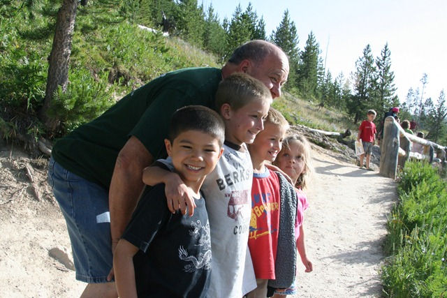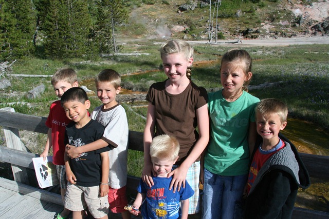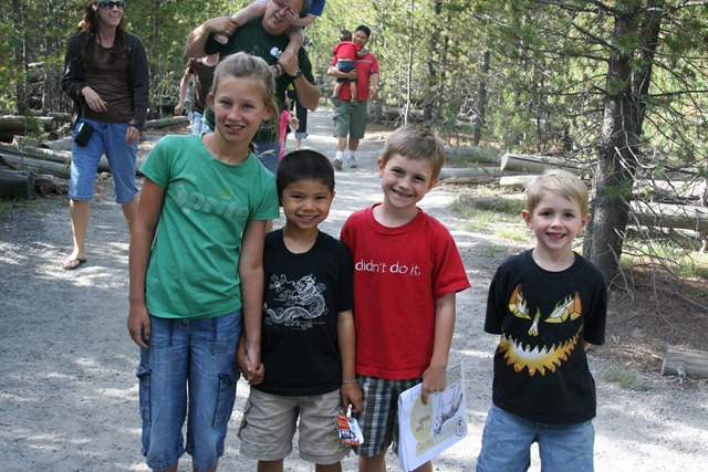 We woke up at 5am, packed our zombie kids in the van hoping they don’t wake up, and started our 12+ hour journey to Yellowstone. The idea was that they would sleep through half of the trip. The plan half way worked. It worked on the Andrew half, but Caleb was excited and it was hard for him to fall back asleep. This was the start of about 40 hours of driving over 5 days. During the drive, we probably watched “Cars” about 4 times in its entirety. We listened to a radio dramatization of the Magician’s Nephew by C.S. Lewis (which was fantastic). We started listening to the Adventures of Huckleberry Finn until Tenille deemed that it was of no redeeming value. (Sorry Mr. Clemens.) I finished my book on tape, “Into the Wild” by John Krakauer. We live in comfortable times, where keeping ourselves entertained over such a long trip is not too difficult. It’s hard to imagine what my sister and I did for this long ride 27 years ago, when we were on this same stretch of road to Yellowstone. Back then, entertainment was pretty much limited to harassing each other (by which I mean me harassing her).