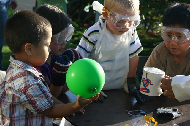 As with anything, presentation is key. Once I convinced all the kids how dangerous dry ice was (and it can do some damage), they were intrigued. Also, I thought that a lab coat would give me some scientist street cred, so Tenille ordered a monogrammed lab coat for me. I wish there was something that easy for my line of work as a software engineer like a hat or colorful socks… I think it’s facial hair and/or baldness, neither of which I’ll ever be endowed with… Fortunately, to become a scientist, all you need is a white lab coat…..