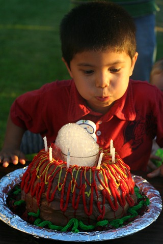 Then, the climax of it all…… The Volcano Cake. Tenille really outdid herself this time. While we were singing the birthday song, the dry ice turned from smoke-effect to soap bubbles. Not what we expected, but it was still pretty cool. The volcano cake will be hard to top. Some days, she must wake up thinking, “Wow… what must it be like to be married to me…. It must be awesome.” And it is… it’s awesome. When Caleb was asked what his favorite part of the party was, he said, “The cake.” When Andrew was asked what his favorite part of the day was, he thoughtfully answered, “Eat… Cake….” It made an impression.