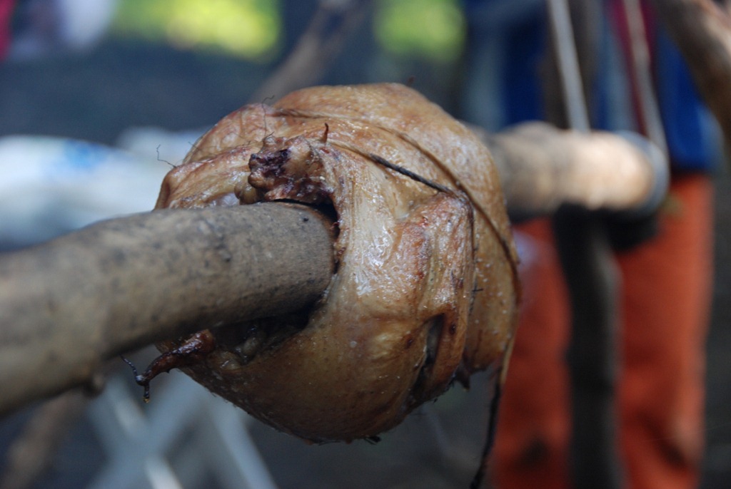 When I was attending school in Boston, I visited a tourist site called Plimouth (Plymouth) plantation.  It’s a living village where actors replicate a 17th century Colonial village.  The one thing I remember is the Native American exhibit.  The Native American lady that was the host at the exhibit was a real Native American.  She wasn’t very friendly, even a bit hostile.  But most importantly, she had a gigantic turkey roasting over an open fire inside her shelter – and it smelled delicious.  Now that I think about it, she may have been hostile, because most of my questions may have revolved around the turkey… rather than the contemporary Native American issues that she wanted to talk about.  I just remember that at that moment, I swore an oath to myself, that I was going to cook some kind of poultry over an open fire the next chance I got.