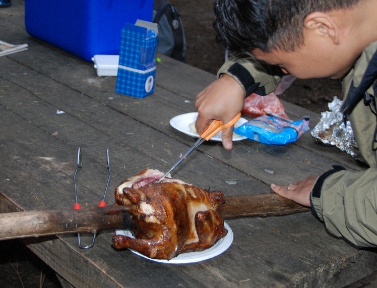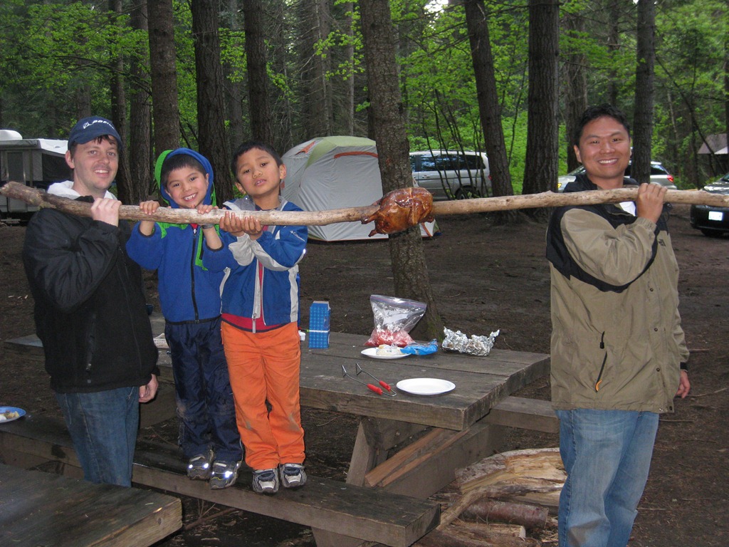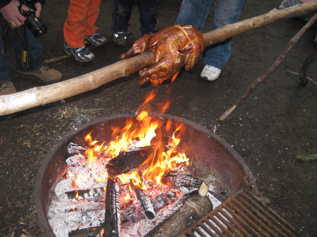 That next chance happened on a scouting campout on Lopez Island in 2005.  I was serving as an Assistant Scoutmaster at the time.   In my mind, the rotisserie is the culmination of a set of scouting outdoor skills – Fire Building, Cooking, and Lashing.  The fire building and lashing are easy compared to the final skill – cooking.  On our first attempt, it wasn’t too difficult to lash up a tripod.  The fire building was also fairly easy.  However, we stayed up until near midnight to get a taste of that bird.  And frankly, only about a 1/3 of it was cooked.  We ate what we could and threw away most of it.