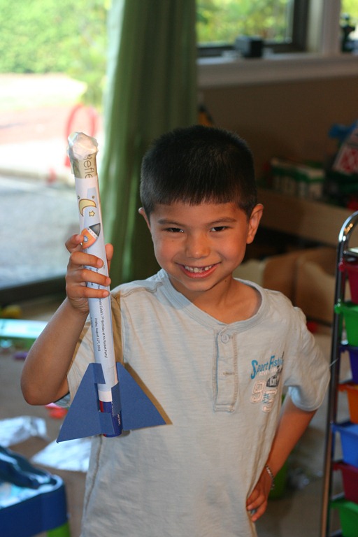 We had a bunch of rocket theme activities planned, but primarily spent our time with the stomp rockets. The invitations themselves were actual stomp rockets this year.![]()