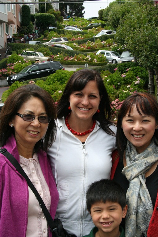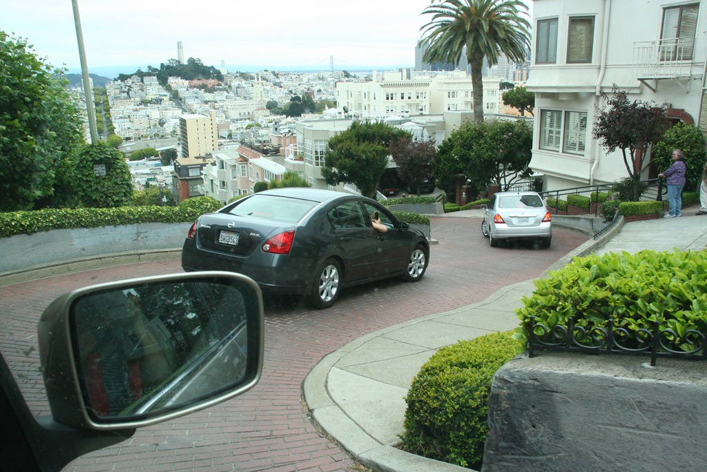 After church, we went back into the city to wait a long hour in the car so that we could weave down the famous Lombard street. This famous section is a steep street that winds back and forth between planters. My understanding is that the purpose of the winding is to slow down the traffic. Well, it seemed to have worked because it takes about an hour to stand in line and weave down this magical street.