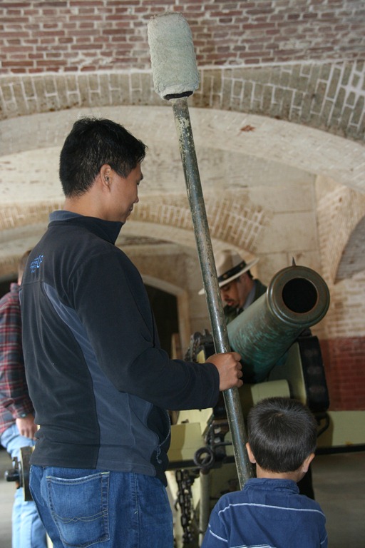 They were giving a demonstration of how to load and fire a cannon. It seemed like a good skill, so I volunteered to help load the cannon. There were 4 of us operating the cannon. 1 person to put the shell into the cannon. 1 person to push the shell all the way down the barrel with a giant Q-tip (that was me.) 1 person to hold his thumb over the vent while the shell is being loaded, then puncture a hold in the shell. 1 person to insert the flint and fire the cannon. They asked for a fifth volunteer. Someone that was really good at giving commands. Tenille immediately raised her hand and she was chosen as our captain. She issued a set of commands, then each of us performed our part in the process. The Park Ranger told us that it normally took a team about 30 seconds to cycle through the loading and discharge of a cannon. It took us about 20 seconds. However, I think I probably would have been much more careful if I was shoving a real cannonball with real gunpowder into the business end of a cannon. I also probably wouldn’t be too quick in shoving a cannonball in right after one just blew out. I’m sure many a soldiers that had the Q-tip job went home without hands. At the end of the demonstration, Tenille and I got Cannoneer certificates.