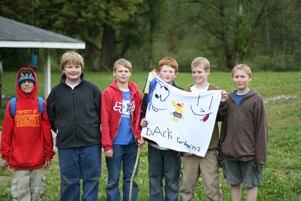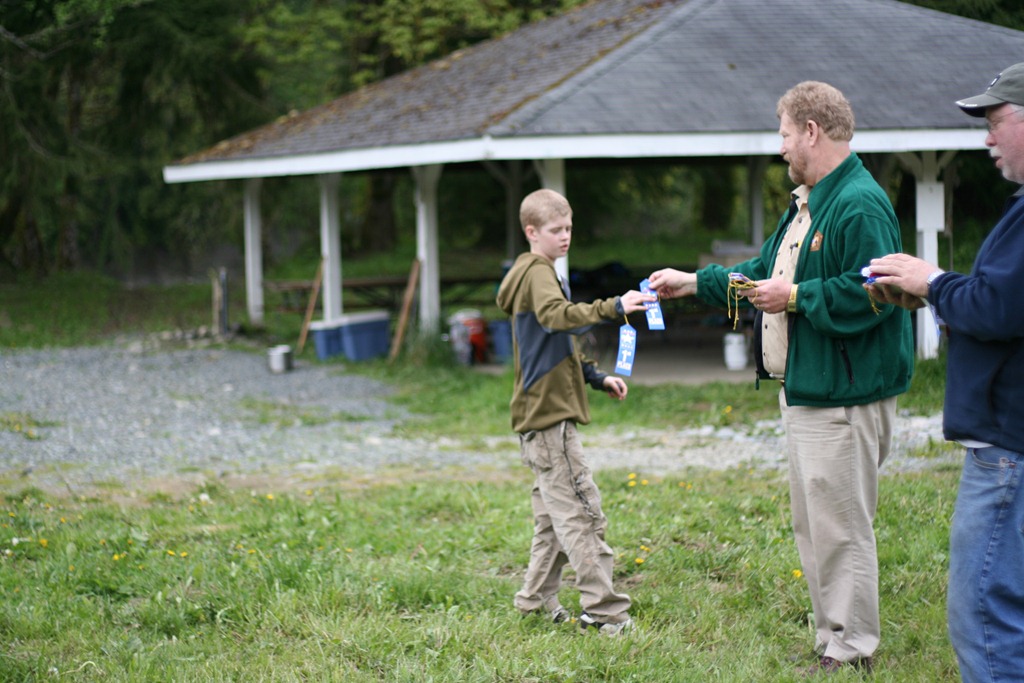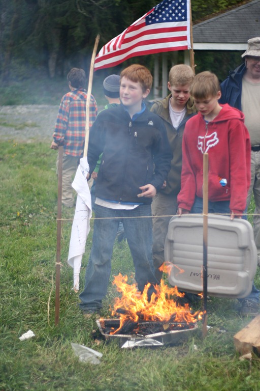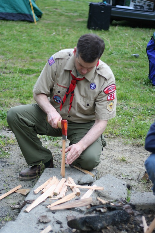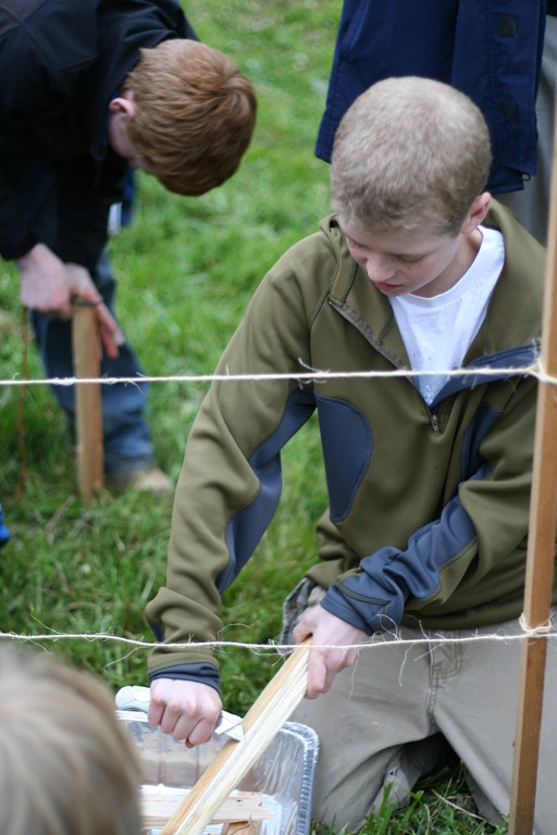 I had a few pictures that I thought were worth sharing – maybe some of them made it into the slide show. This was at a campout where we were learning how to build fires, and the first team to burn through the top string won.