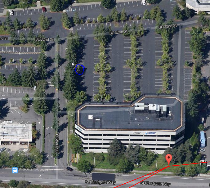 Here is once example.  I was sitting in the parking lot (blue circle) of where I work for this GPS reading.  The Red Dot is the GPS reading.    If the phone lands in the woods, this is a LARGE area to search.  There are some readings that are up to a mile off.