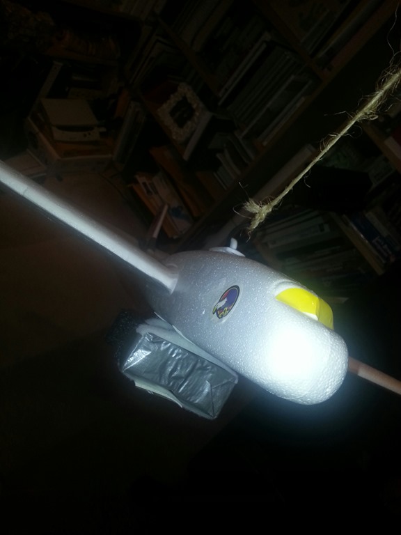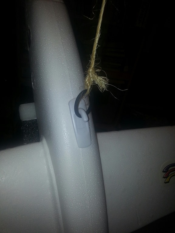 On the top side of the plane is a hook. The balloon is attached via an O-ring tied to some twine. When the balloon pops, the drag on the balloon should slip it off of the hook and the plane should be free and clear of the remains of the balloon. If the balloon stays attached, I was afraid that the airplane would not fly properly causing it to descend faster than it should, OR cause excessive vibrations affecting the photography.