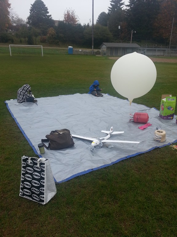 We set out a tarp in the middle of the field because I’ve read that the weather balloon can be very delicate and it probably shouldn’t come in contact with grass or dirt. The weather was foggy and overcast which is not untypical for this time of year. A little disappointing as the weather forecast said that it would be sunny.