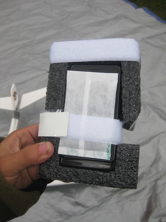 I first set up the glider. I power cycled my phone, then started my program which took pictures and sent me a text message every 36 seconds. Why 36 seconds? In our final testing, I found out that if any applications sends more than 100 texts in an hour, then a confirmation dialog box pops up. Since I will not be there with the phone to confirm I’d like to send the text, I had to limit the texts to 36 seconds to stay within the limit. I confirmed that Tenille’s phone was receiving the GPS texts, then strapped the phone into the case. I also strapped on a 7 hour hand warmer. At high altitudes, the temperatures can get frigid and apparently, it can make your phone stop working.