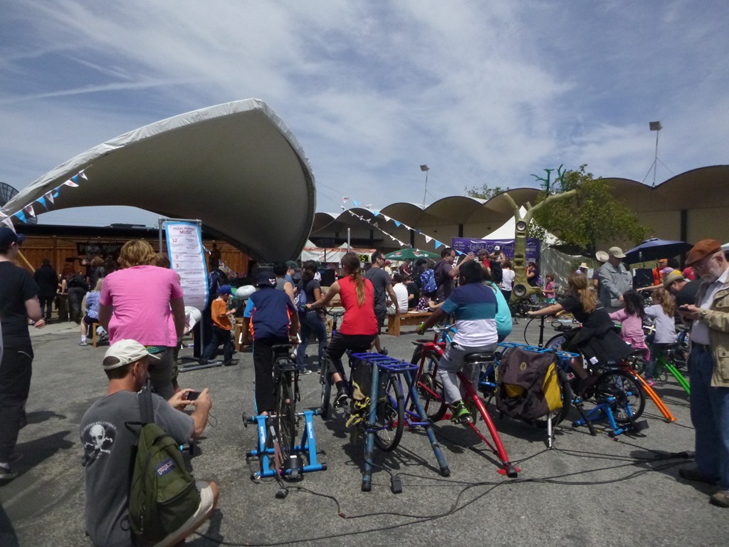 Music stage entirely powered by bicycles. Apparently, they would lose power if there’s not enough juice coming from the bikes.