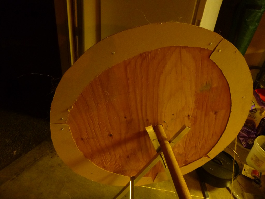 The toughest part about making the rotisserie was hand-crafting a sheave. I made one by drawing a circle on a piece of plywood, then cutting it out using a jig-saw. My plan is to use twine to turn it. So, I need to make guards around the edges so that the twine doesn’t slip off. I got some thin MDF and cut out portions of a circle, then screwed it onto the sheave.
