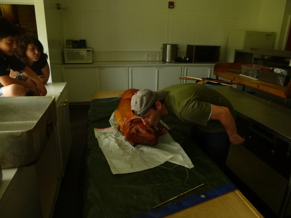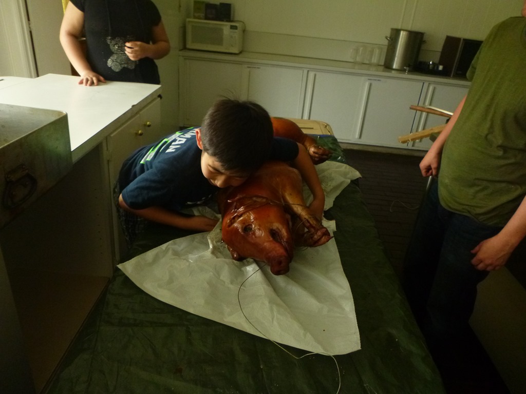 At 6pm, people were starting to arrive. We took the pig out of the oven. Several volunteers came and helped chopping up the pig. Cutting up the pig was a lot of work. There was about 70 people to feed. We had to cut up the meat in small pieces. We found that there was still a little bit of pink around the thighs, so we just put those pieces back in the oven. We kept the head intact for guests to take pictures with. But, eventually throughout the night, we cut up all the meat on the head, too. There was only a zip-loc bag of meat left by the time it was all over. It seems like a 60 lb pig will feed about 80 people (provided there are other side dishes.)