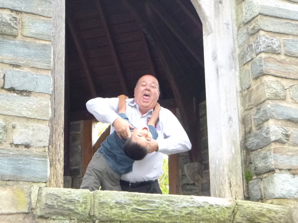 Andrew and Grandpa fighting over who gets to ride in the stroller. (j/k – just goofing around in the cathedral garden.)