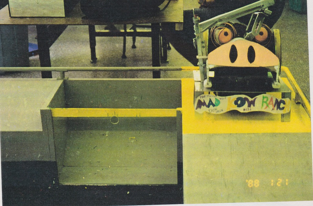 The robot game was to sweep up a bunch of ping pong balls and then climbing up a ramp to dump them into a bin from the top. However, these bins had a sliding plexi-glass door on the side that slid upward. If you were somehow able to slide up the plexi-glass door, you could just shove all the ping pong balls into the bin rather than taking it up the ramp and dumping them in at the top.